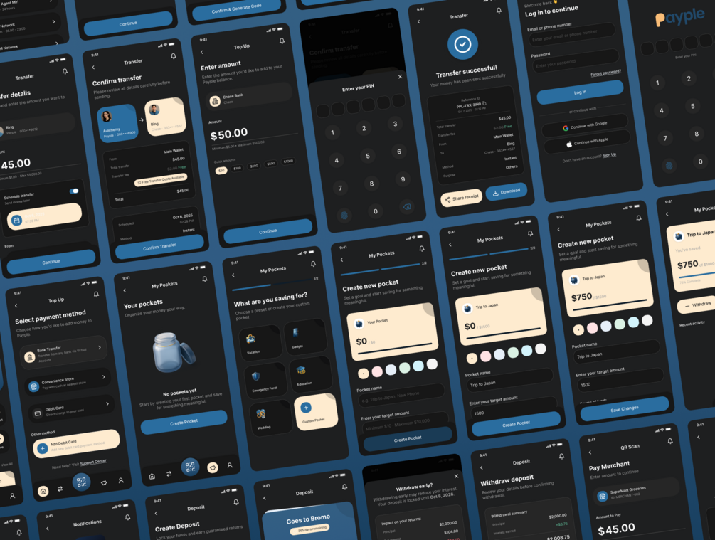 It includes complete flows for digital banking, pockets and savings, money transfers, deposits, QR payments, top-ups, and cash-out, everything you need to craft a seamless financial experience.