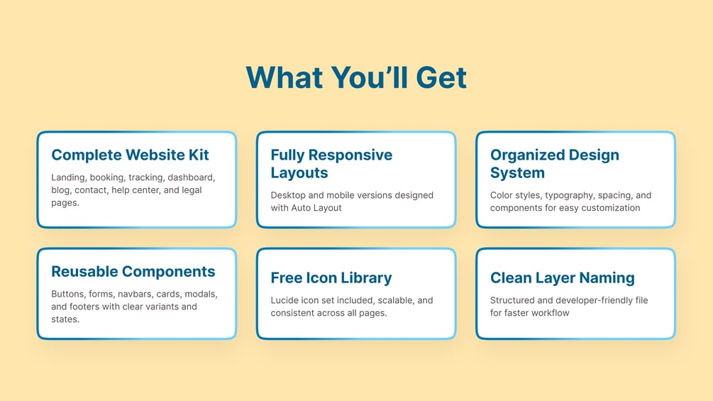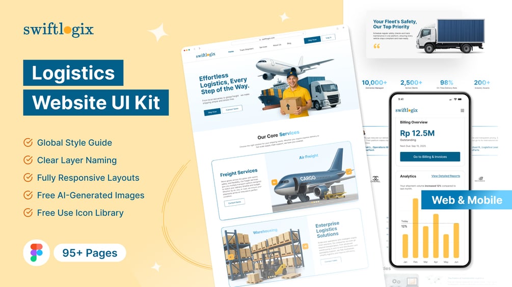 A fully 95+ pages organized Figma UI kit for logistics websites, including design system, components, icons, and ready-to-use desktop and mobile layouts.