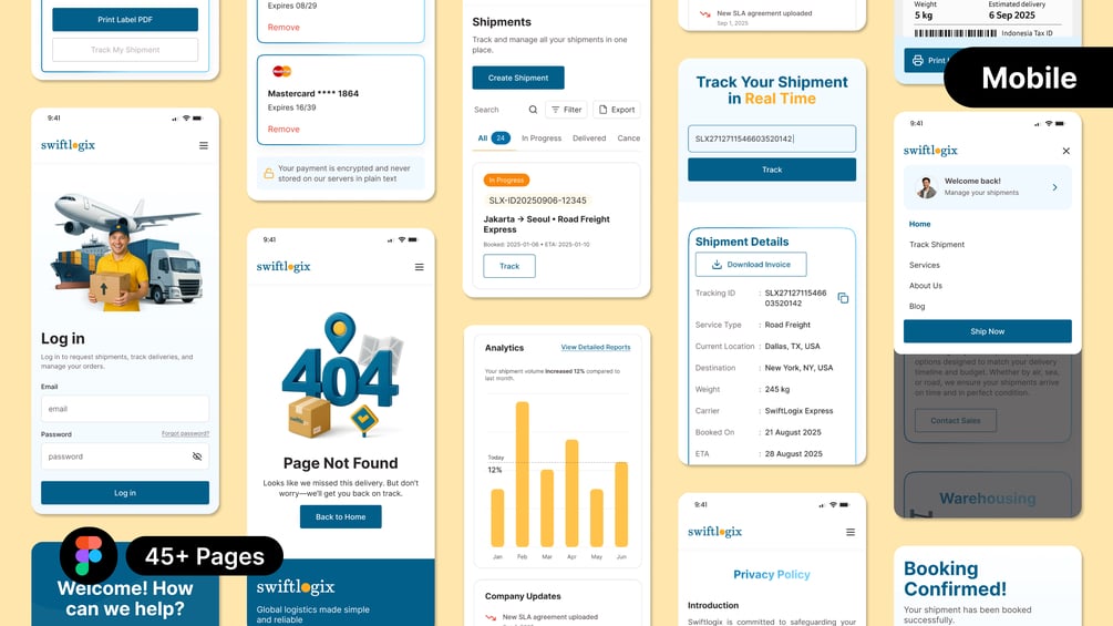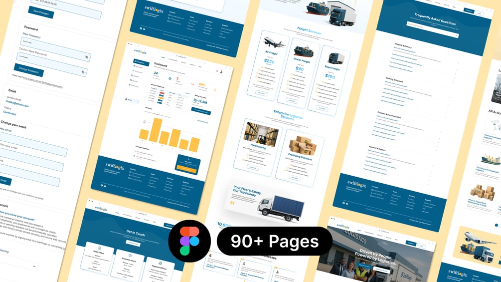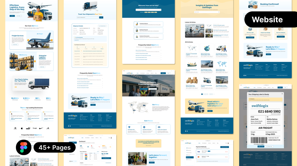 Swiftlogix is a complete logistics website UI Kit for Figma, designed to help you create a professional shipping and freight platform quickly. It includes desktop and mobile versions for every page, a complete design system, and reusable components for a faster workflow.